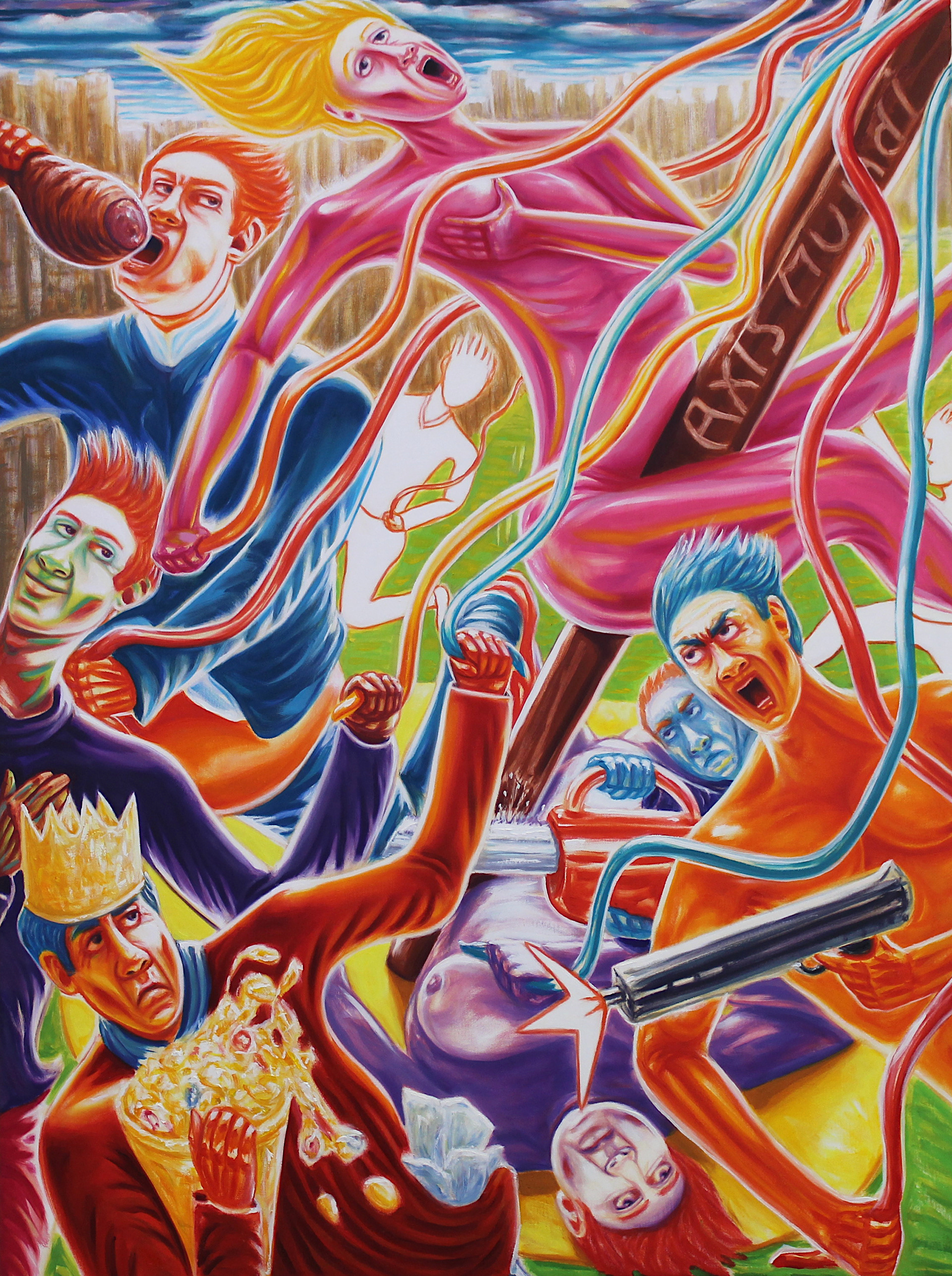 My research is not concerned with a wholly political view, of current cultural paradigms. Although, political overtones may be present. I am also unconcerned, with the specific characterisation of political or public figures and celebrities. Any characterisation will be within, and limited to, the subtleties of the visually humorized aesthetic of the characters. The characters are the constituents of any given pictorial scenario and are related to the everyman. Rather, I wish to engage in a form of satirical social commentary, Satire specific to social commentary within the painting is relatively unchartered. The narrative form of the work I am proposing is biased toward an overview of contemporary society, and realised through both my own creative imagination, and technique, and characterised by social, ethical and moral dilemmas pertinent to the everyman and everyday life, within modern society.